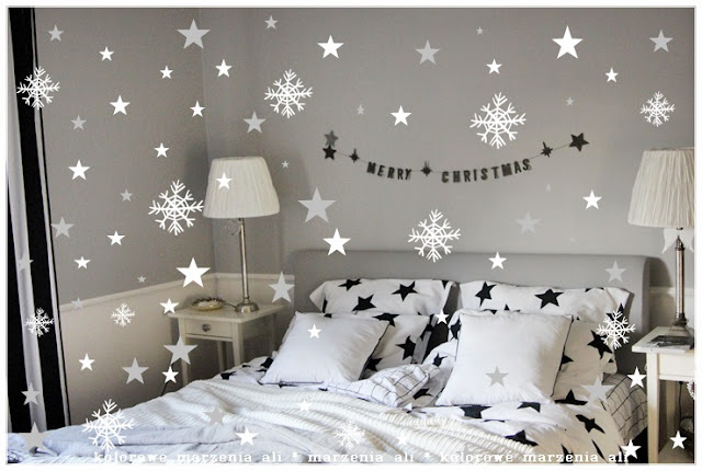 Motyw ten jest z nami przez cały rok. Najwięcej go w pokojach dzieci, trochę w kuchni, w salonie. Jednak okres przedświąteczny to istny wysyp gwiazdek ! Zawitały również do sypialni. Coż mogę powiedzieć, hm, napisać, na ten zimowy czas zaplanowałam pościel w bieli z odrobiną szarości. Miało być szaro, jasno, miałam powiesić szare zasłony, i co ?, i nic, figa z makiem" , przez przypadek wpadła mi w oko pościel , pościel biało- czarna, ale jaka pościel ... w gwiazdy ! No i wpadłam jak "śliwka w kompot" chciałoby się rzec ale nie powiem bo tak zrobiłoby się zbyt kulinarnie /figi, mak, śliwki, kompot !/
